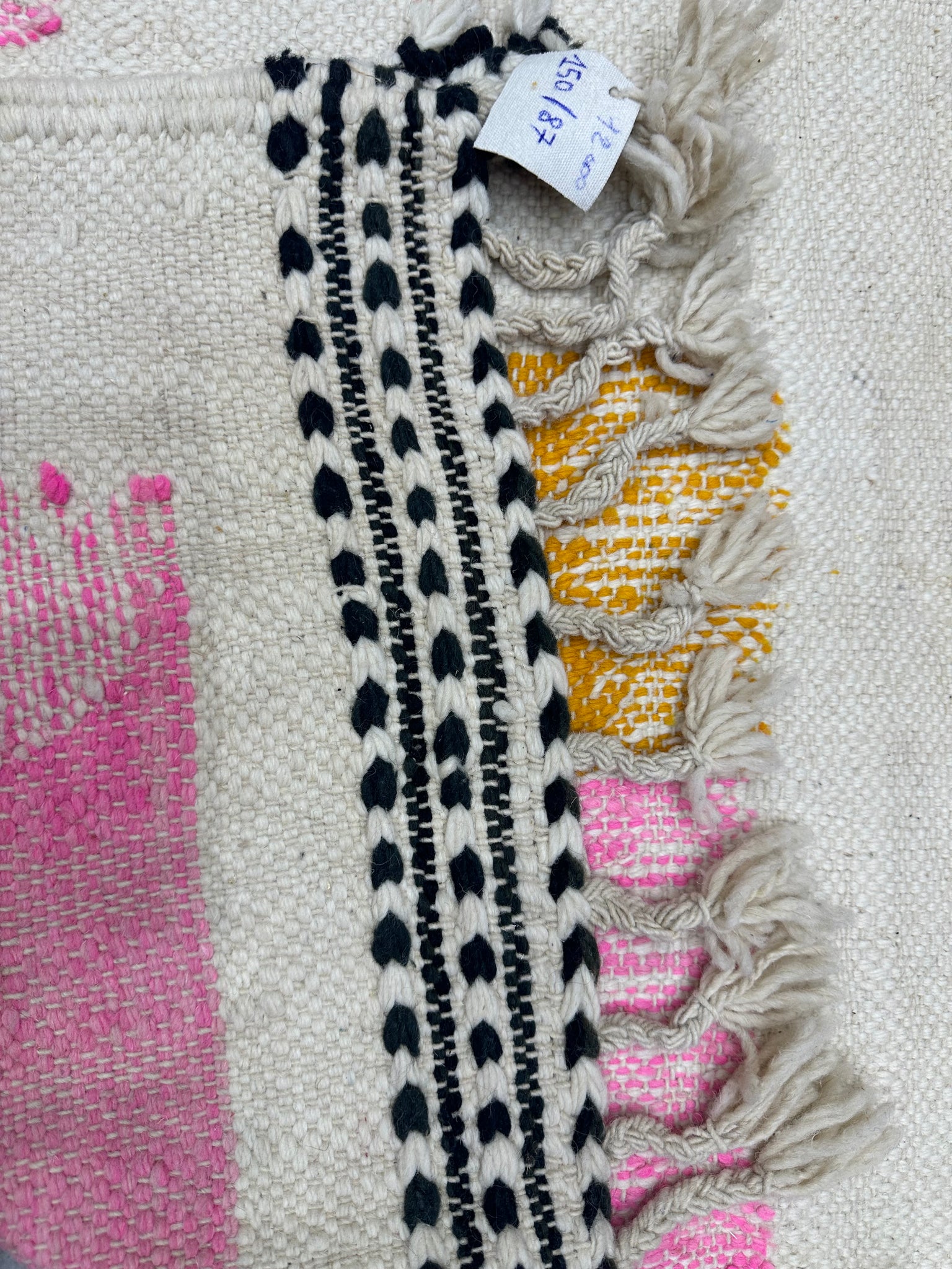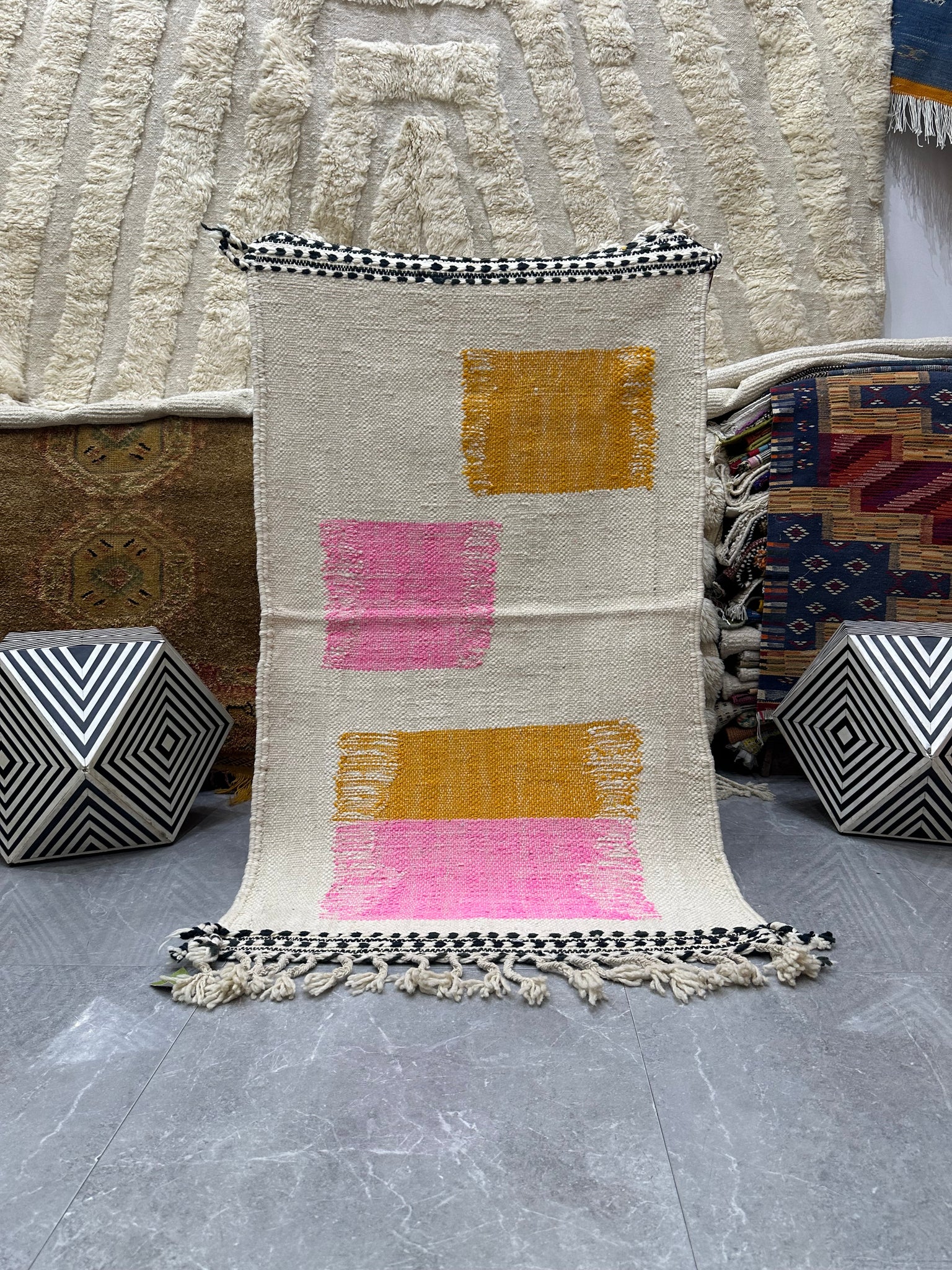 Modern killim rug, hand knotted by talented Berber dexterous weavers and professionally washed in boujaad City. 100% premium wool and all natural organic ingredients are used to ensure pliability, a plush feel and exceptionally soft texture of these beautiful rugs.
