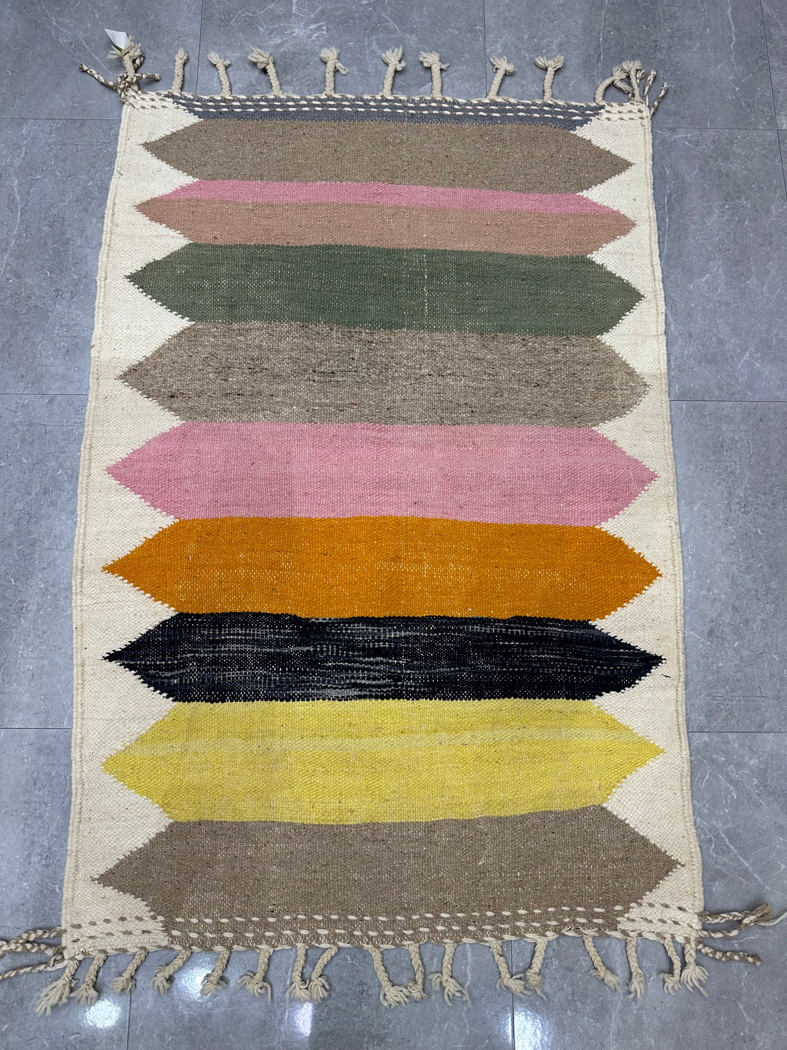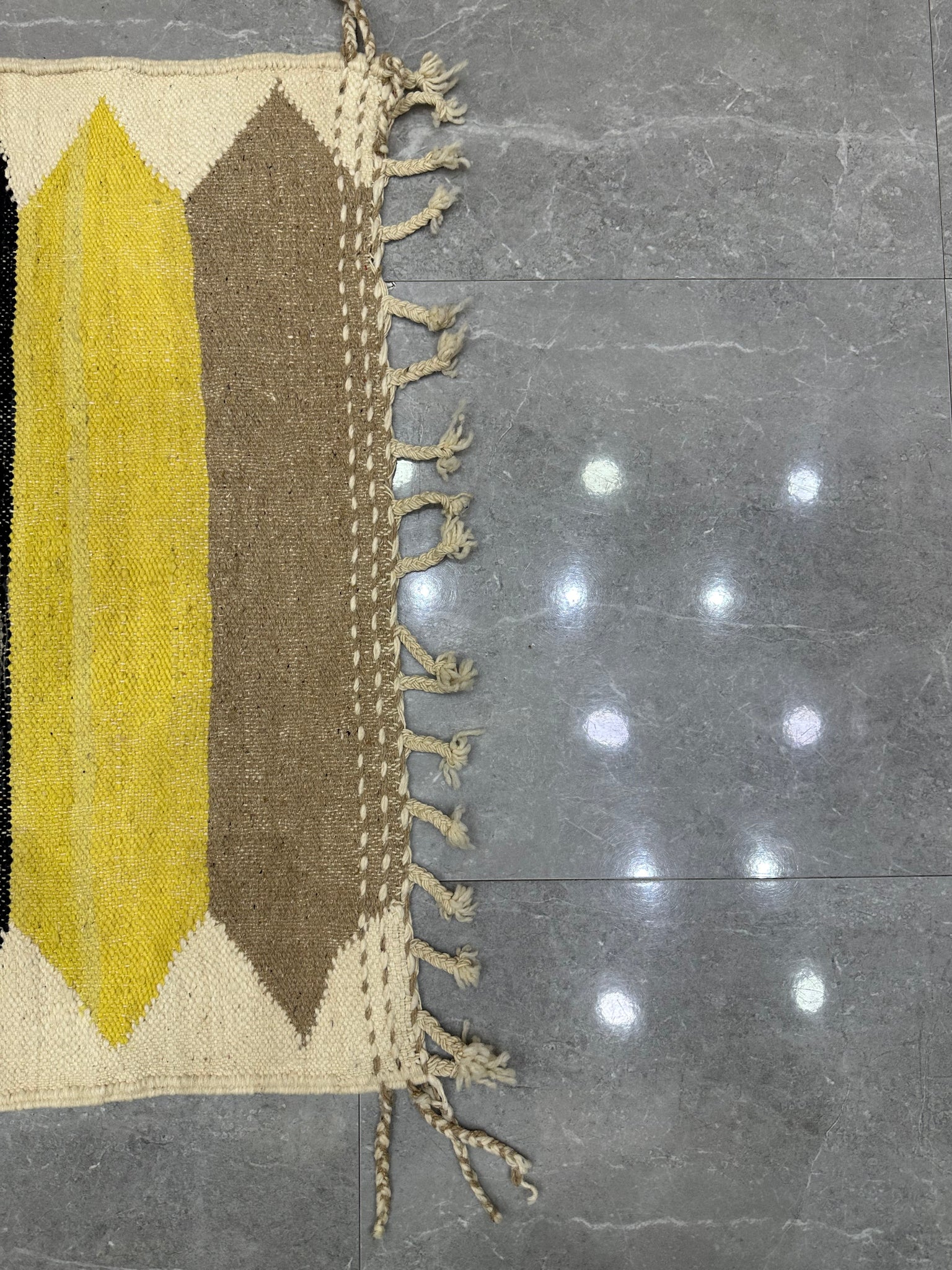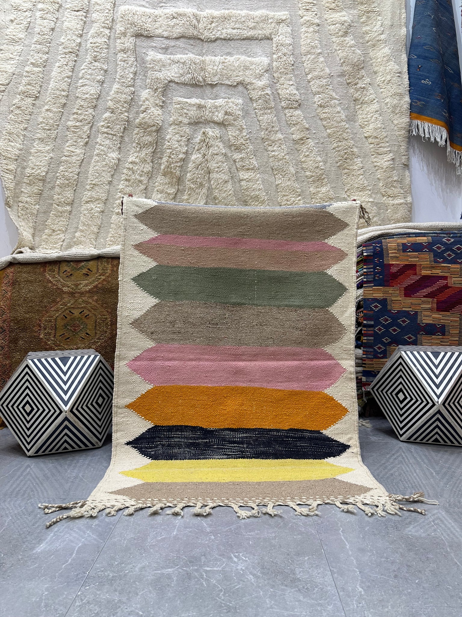 Modern killim rug, hand knotted by talented Berber dexterous weavers and professionally washed in boujaad City. 100% premium wool and all natural organic ingredients are used to ensure pliability, a plush feel and exceptionally soft texture of these beautiful rugs.
