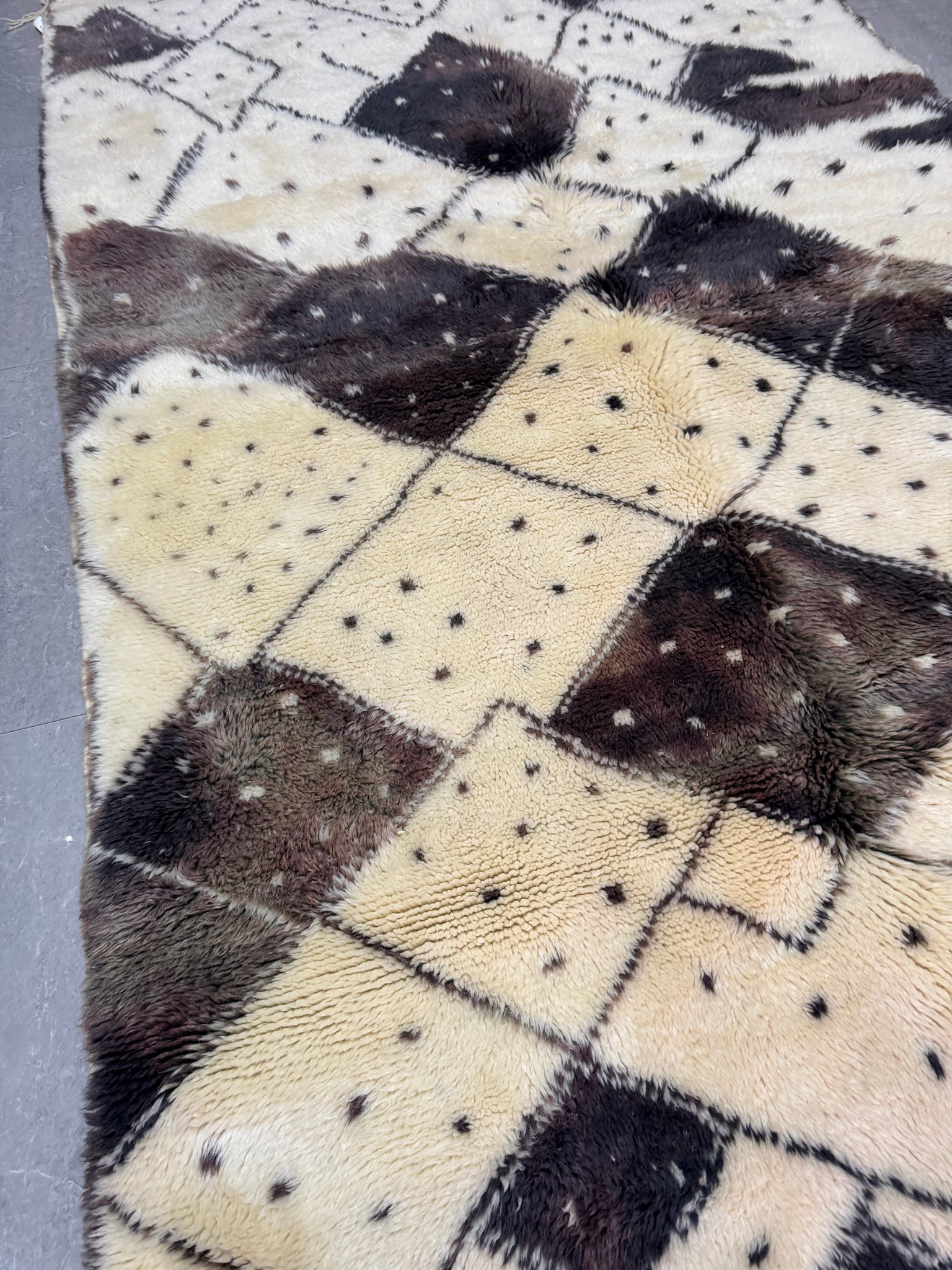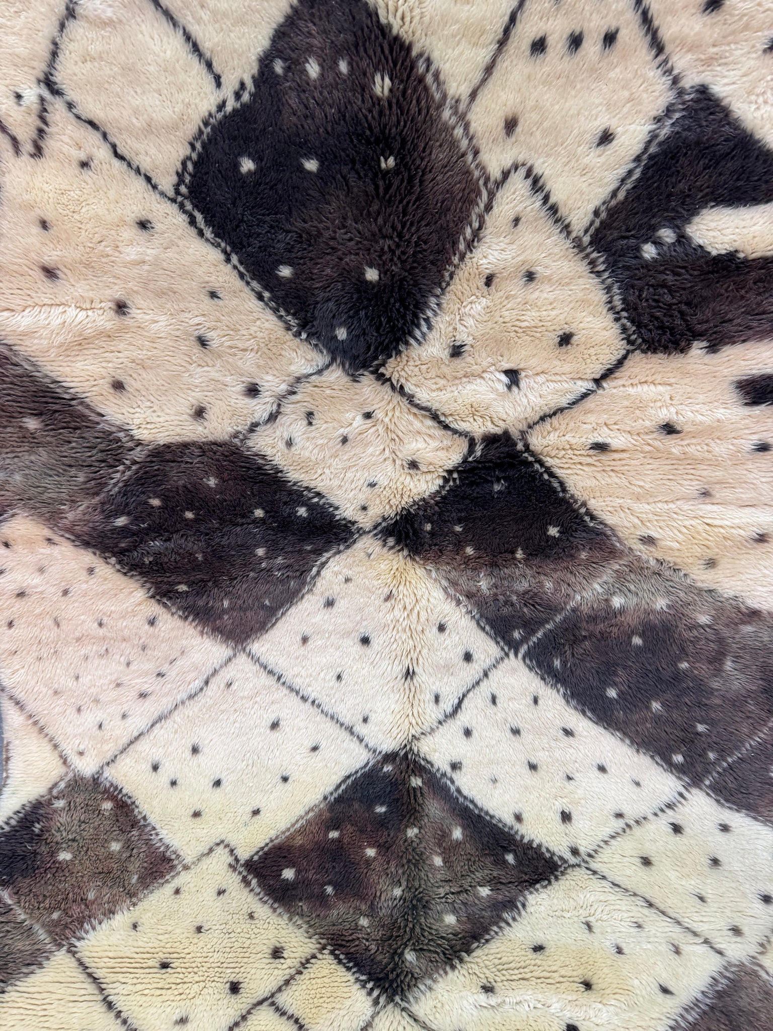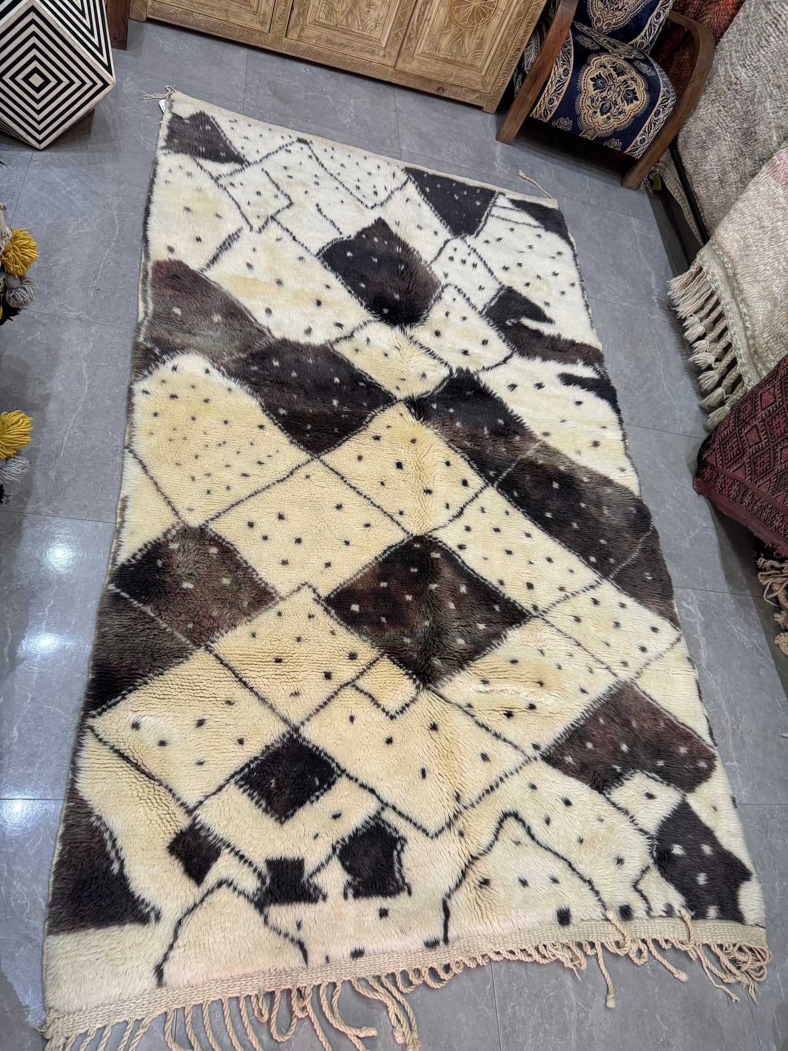 Modern Beni OURAIN rug, hand knotted by talented Berber dexterous weavers and professionally washed in Khenifra City. 100% premium wool and all natural organic ingredients are used to ensure pliability, a plush feel and exceptionally soft texture of these beautiful rugs.
