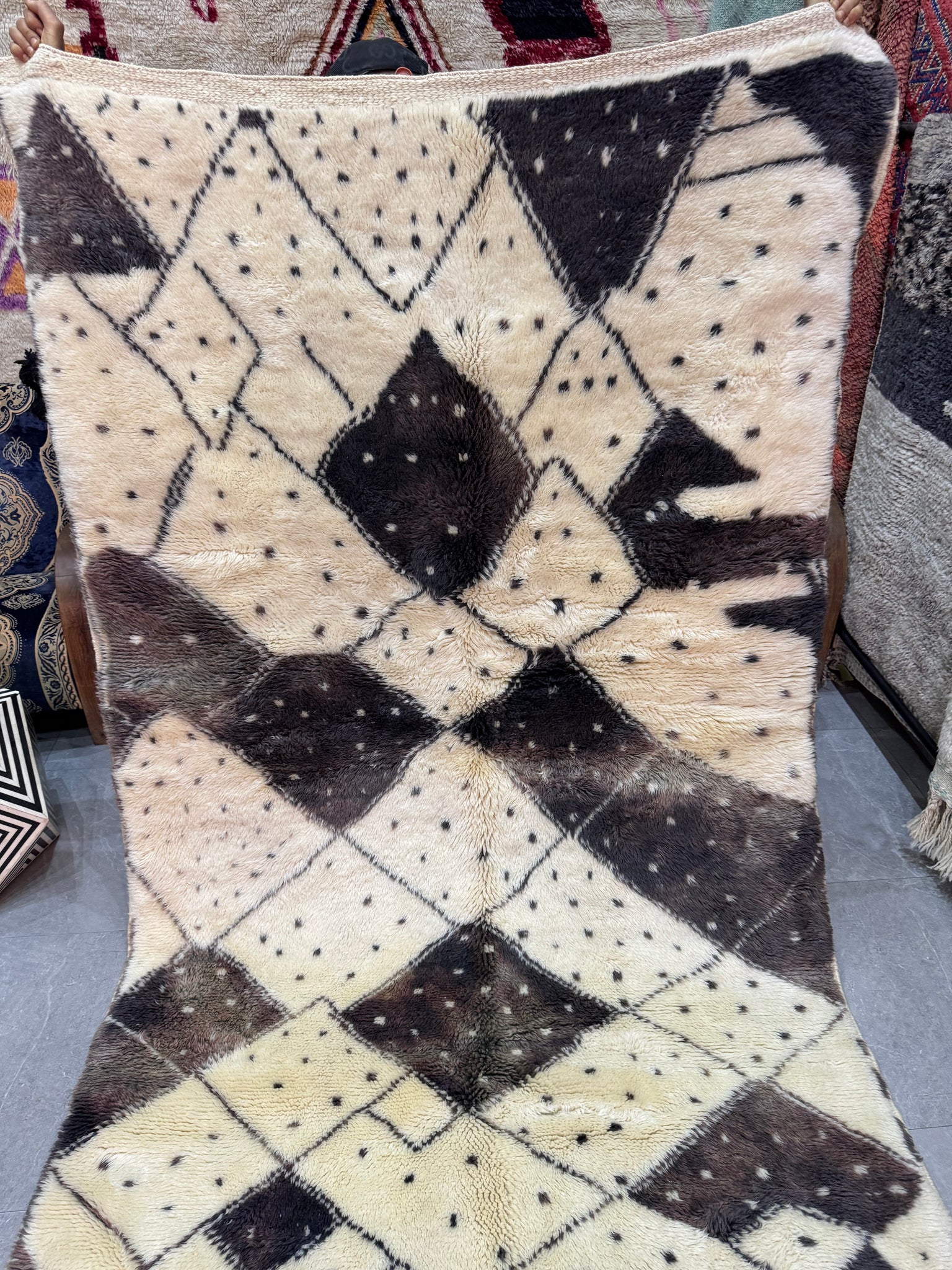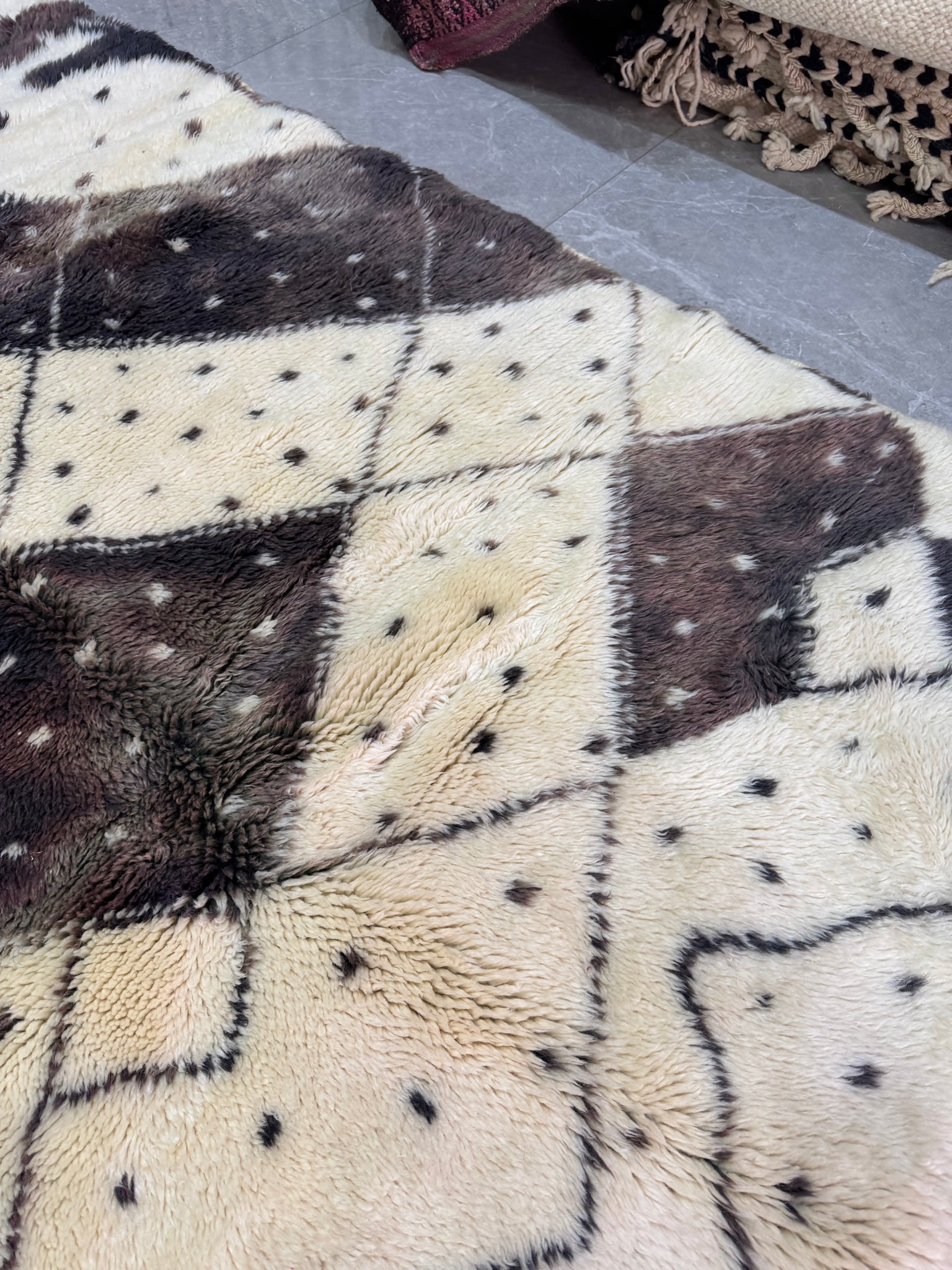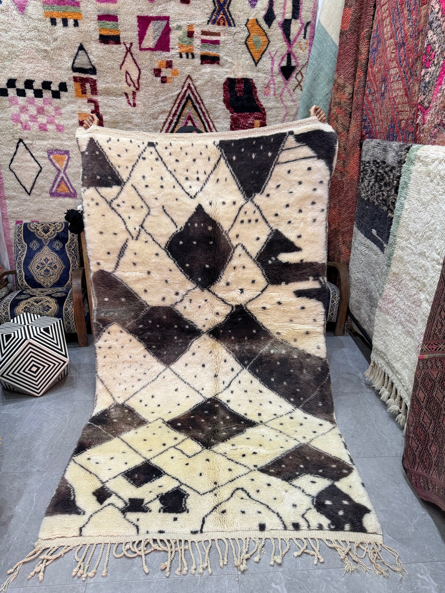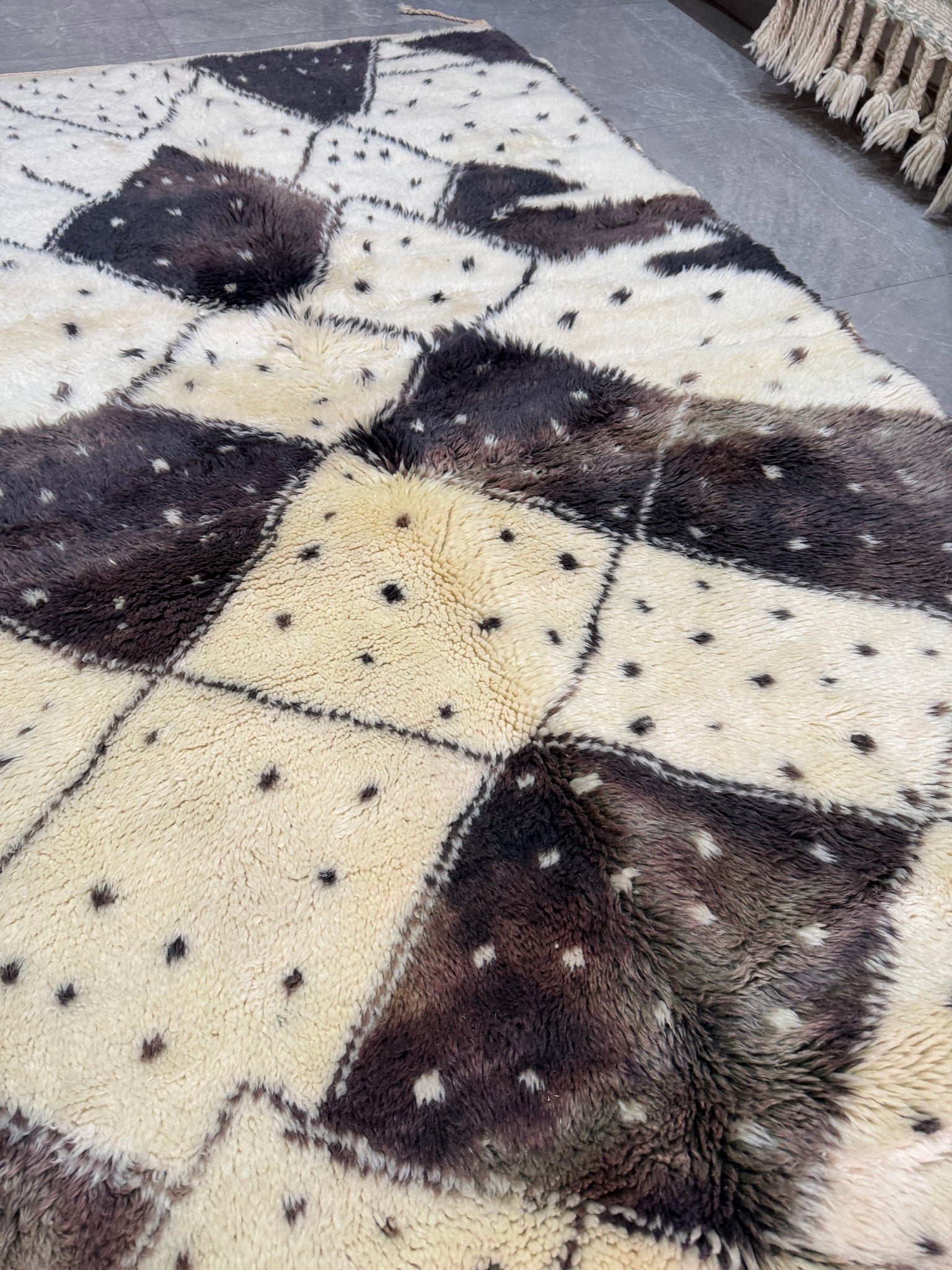 Modern Beni OURAIN rug, hand knotted by talented Berber dexterous weavers and professionally washed in Khenifra City. 100% premium wool and all natural organic ingredients are used to ensure pliability, a plush feel and exceptionally soft texture of these beautiful rugs.