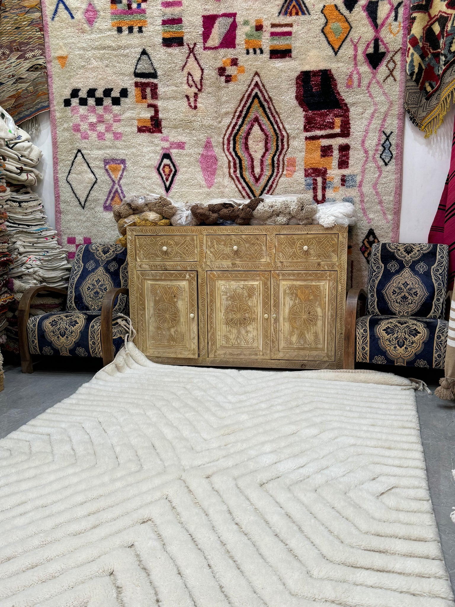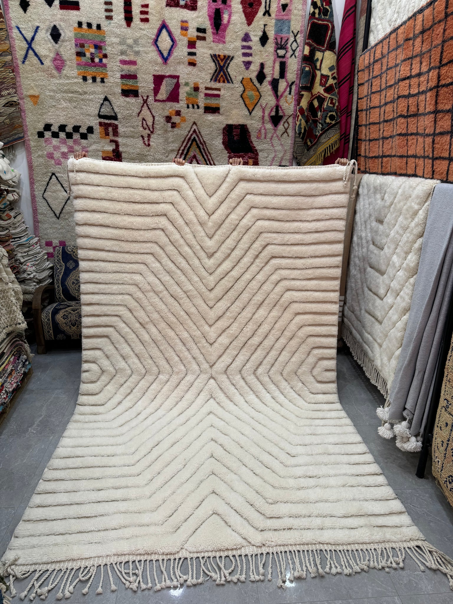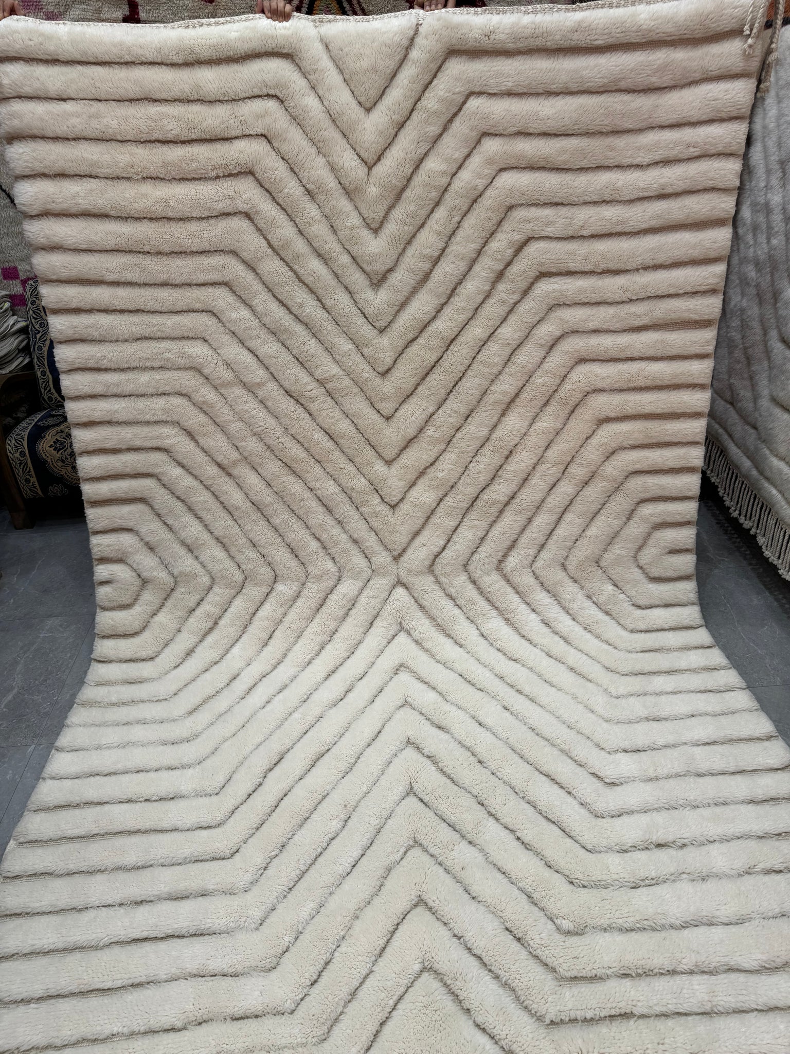 Modern Beni OURAIN rug, hand knotted by talented Berber dexterous weavers and professionally washed in Khenifra City. 100% premium wool and all natural organic ingredients are used to ensure pliability, a plush feel and exceptionally soft texture of these beautiful rugs.